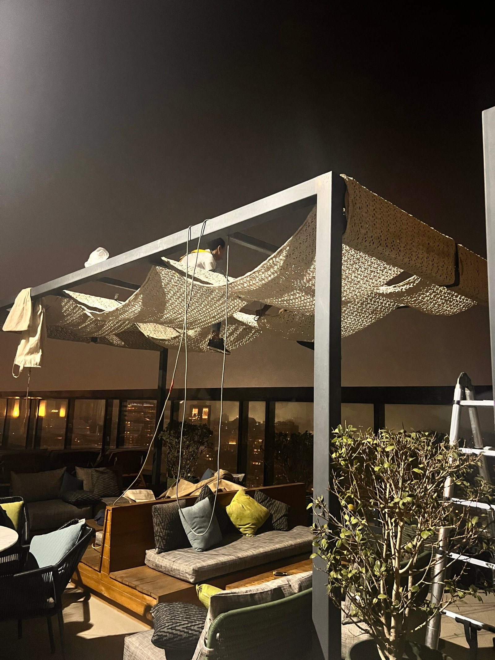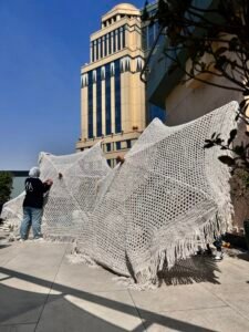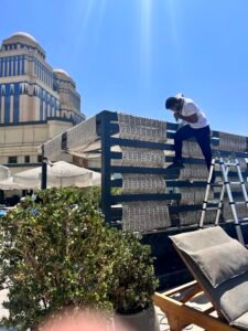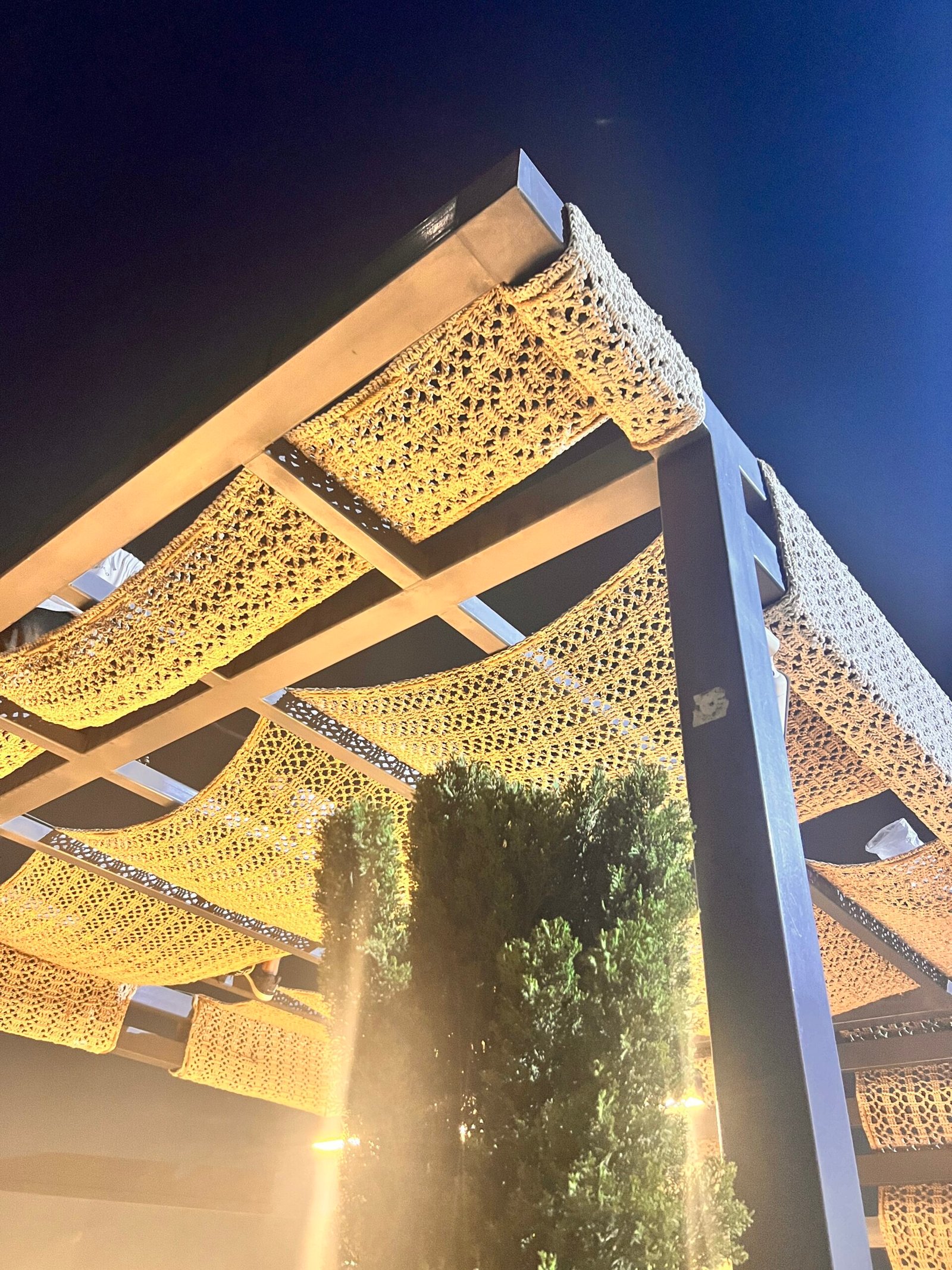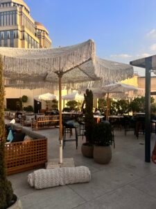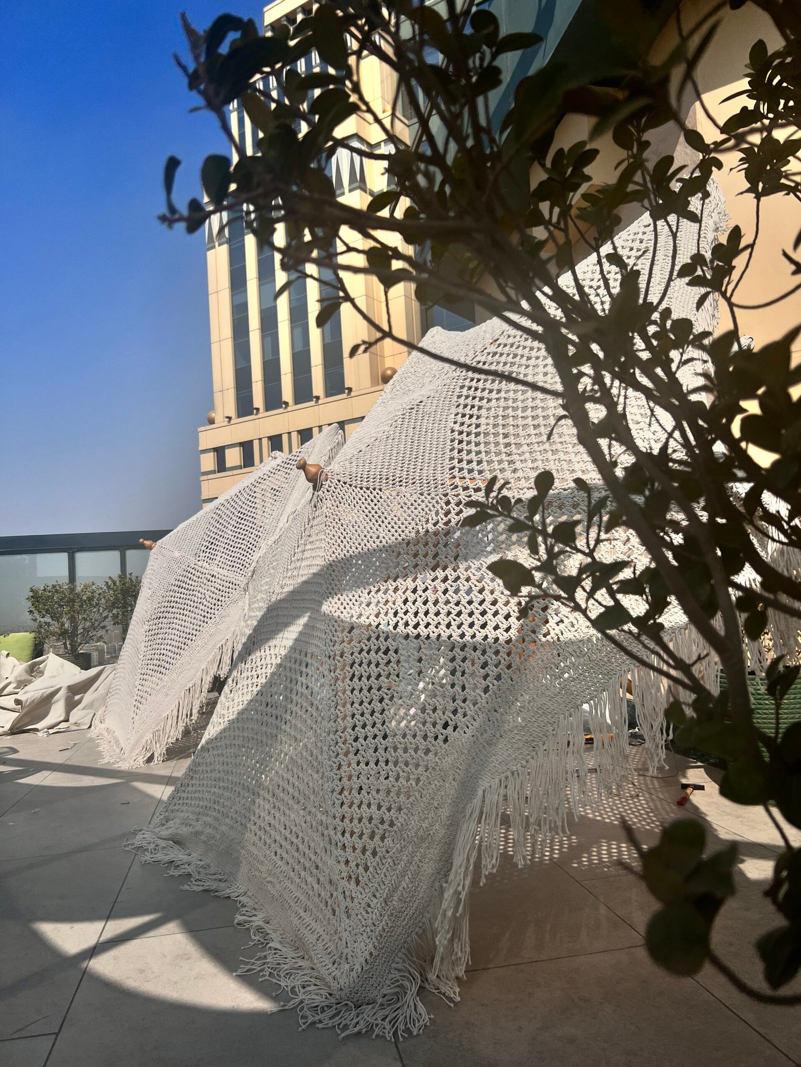 In this project, our company provided a collection of white umbrellas and pergolas, enhancing the visual appeal and comfort while uniquely blocking sunlight